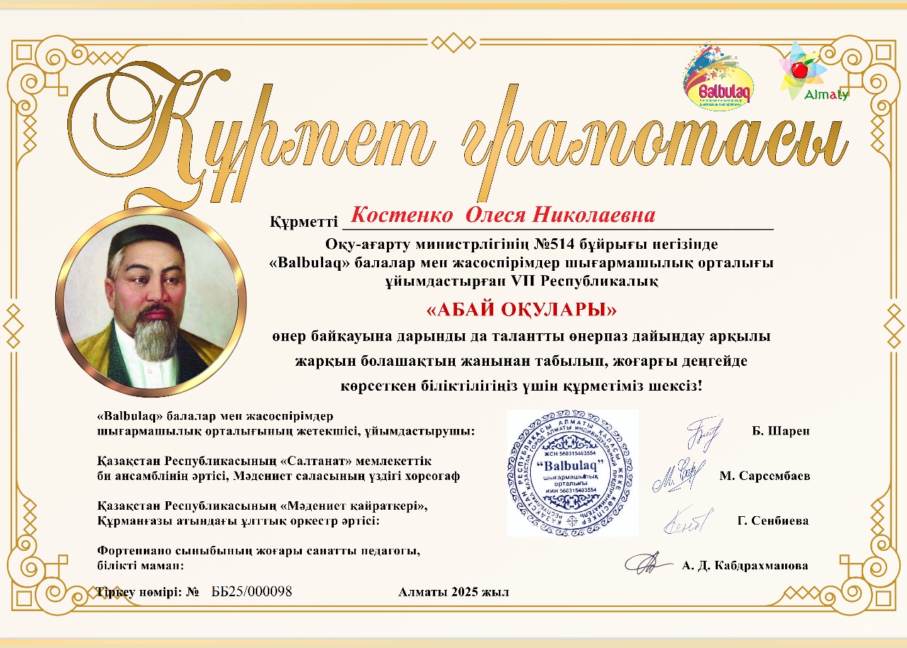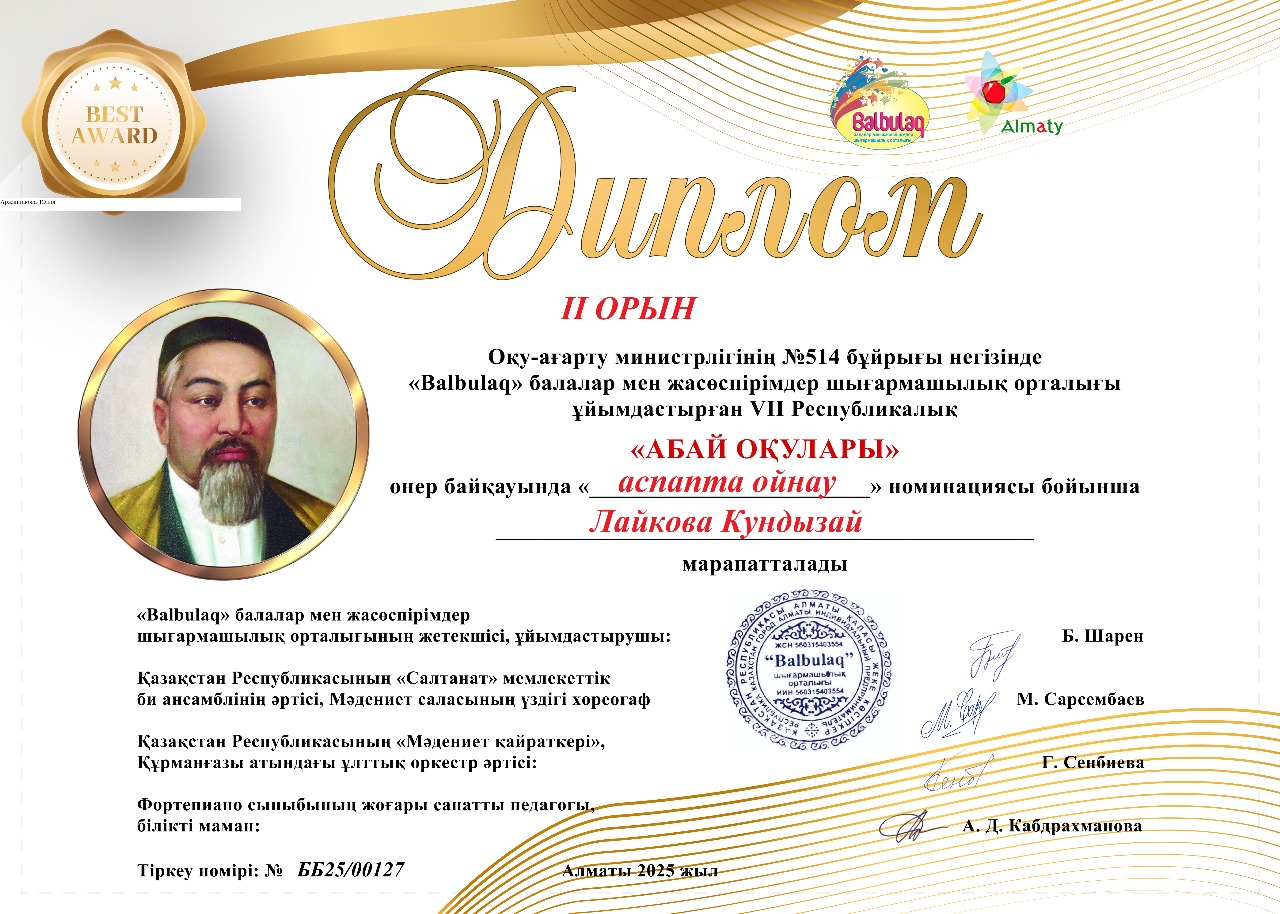 Также эти же учащиеся готовились и выступали на Областном 59м Конкурсе "Жас Музыкант". Все были награждены сертификатами за участие от Областного отдела образования Туркестанской области...равно как и преподаватели Кузнецова Л. Н. И Маслова К. Е.. её ученица 4 класса гитары Лейба Маргарита выиграла спец.номинацию "За волю к победе. "3й Республиканский Конкурс имени Абая - Жанабек Д 2й класс аккордеон Лауреат Бас Жулде! Серикбай Н. - Лауреат 2й премии.