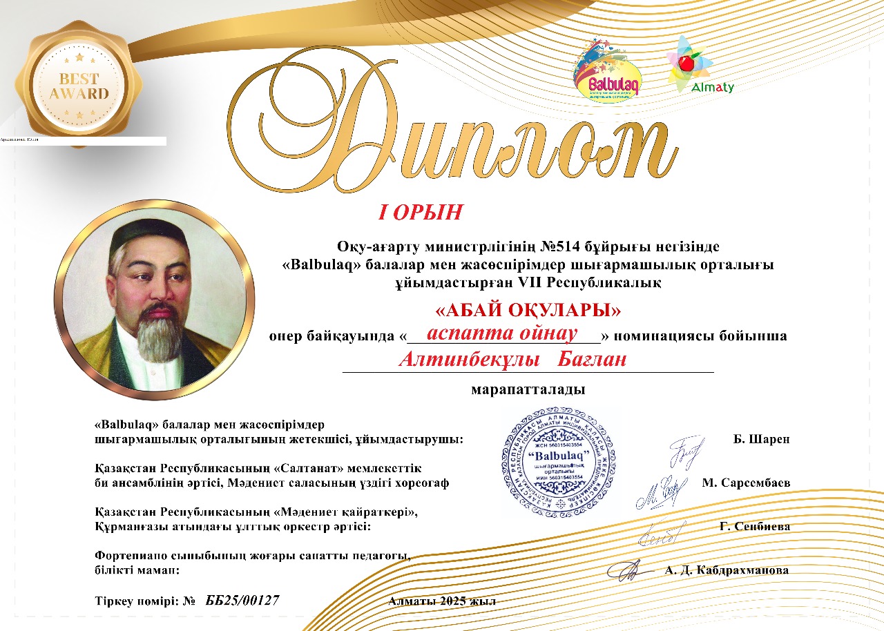 Астана международный офлайн конкурс Дара - Дала - Лауреат 1й премии Инкарбек Бауыржан.В классе гитары также в этом году лауреаты 6го Республиканского конкурса имени Мукагали Макатаева 1я премия - Утвенко Артемий и 1я премия Ахметов А.